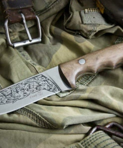 When producing blades, Russian stainless steel, carbon and last but not least high quality damask steel of our own production is used. Steel 65X 13 is used in the basic variant. After tempering to 56 – 58 HRC temper, this steel facilitates excellent cutting characteristics for a longer time. Blades are different thanks to comeback to traditions which includes decoration with various decorative motives. These involve hunting scenes, pictures of wildlife and birds or the traditionally stylised plant motive. Furthermore, each product can be embellished with silver, nickel silver or blackening. The final look of each knive is unique and ever unrepeatable. An individual sheath is produced for each knife or sabre which can also be decorated with traditional motives using stamping or engraving.