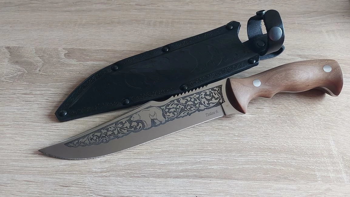 When producing blades, Russian stainless steel, carbon and last but not least high quality damask steel of our own production is used. Steel 65X 13 is used in the basic variant. After tempering to 56 – 58 HRC temper, this steel facilitates excellent cutting characteristics for a longer time. Blades are different thanks to comeback to traditions which includes decoration with various decorative motives. These involve hunting scenes, pictures of wildlife and birds or the traditionally stylised plant motive. Furthermore, each product can be embellished with silver, nickel silver or blackening. The final look of each knive is unique and ever unrepeatable. An individual sheath is produced for each knife or sabre which can also be decorated with traditional motives using stamping or engraving.