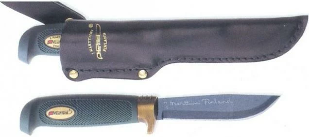 For blades making Marttiini uses carbon steel, carbinox T508 and rustproof chromic steel 440C, 4034, 420C. MARTEF coating improves cleaning and resistance against corrosion of the blade. A traditional material for handle making is Finnish curly birch which is durable and very beautiful. With some models birch is treated by heat which gives wood dark colour of hard wood. They also use classic birch, Pakka wood, rosewood and rubber blends. Sheaths are made of natural varnished leather, plastic and nylon fibre Cordura from DuPont company.